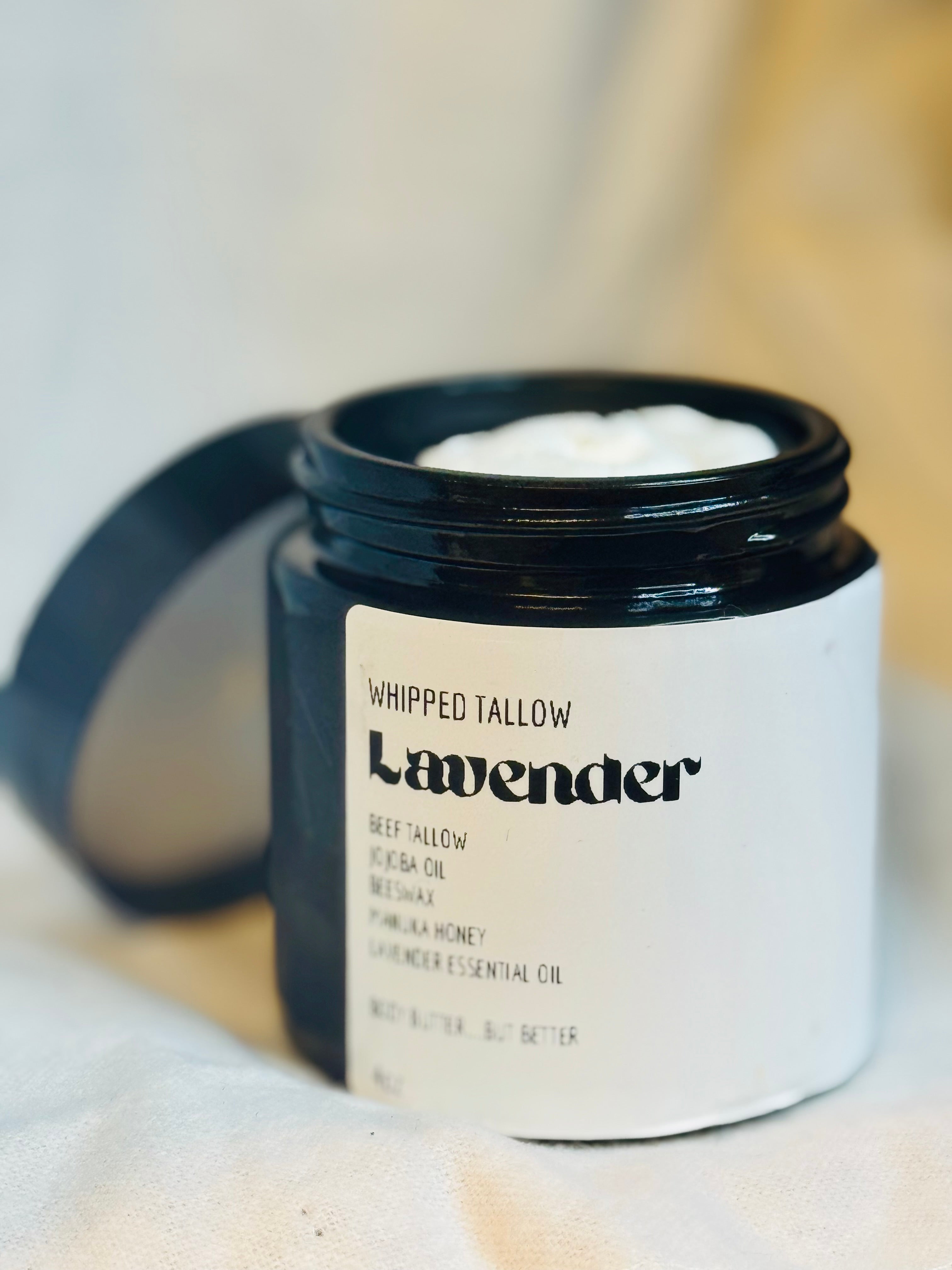 Beef Tallow, Beeswax, Jojoba Oil, Manuka Honey, Lavender Essential Oil